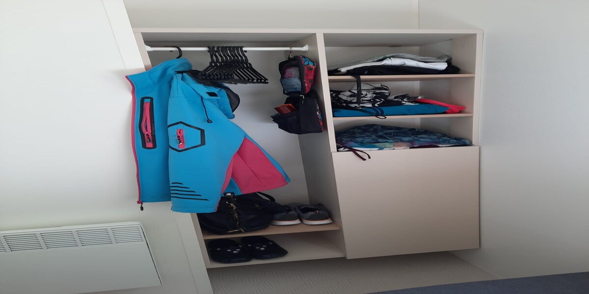 - Schlafzimmer2 mit Kleiderhaken, Nachttischablage, Wandregal und Platz für z.b. Hundekörbchen